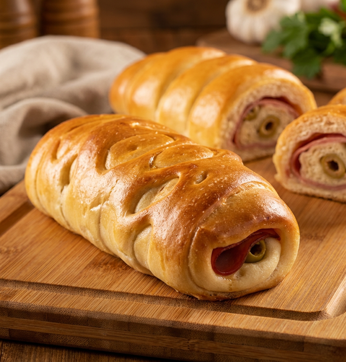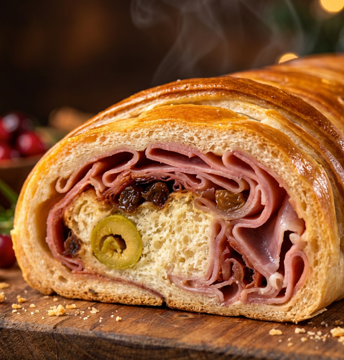 Pan relleno con 375 gr jamón acaramelado, 125 gr de tocino ahumado , aceitunas y pasas, horneado con masa suave y dorada. Sabor equilibrado entre lo salado y lo dulce, perfecto para ocasiones especiales.